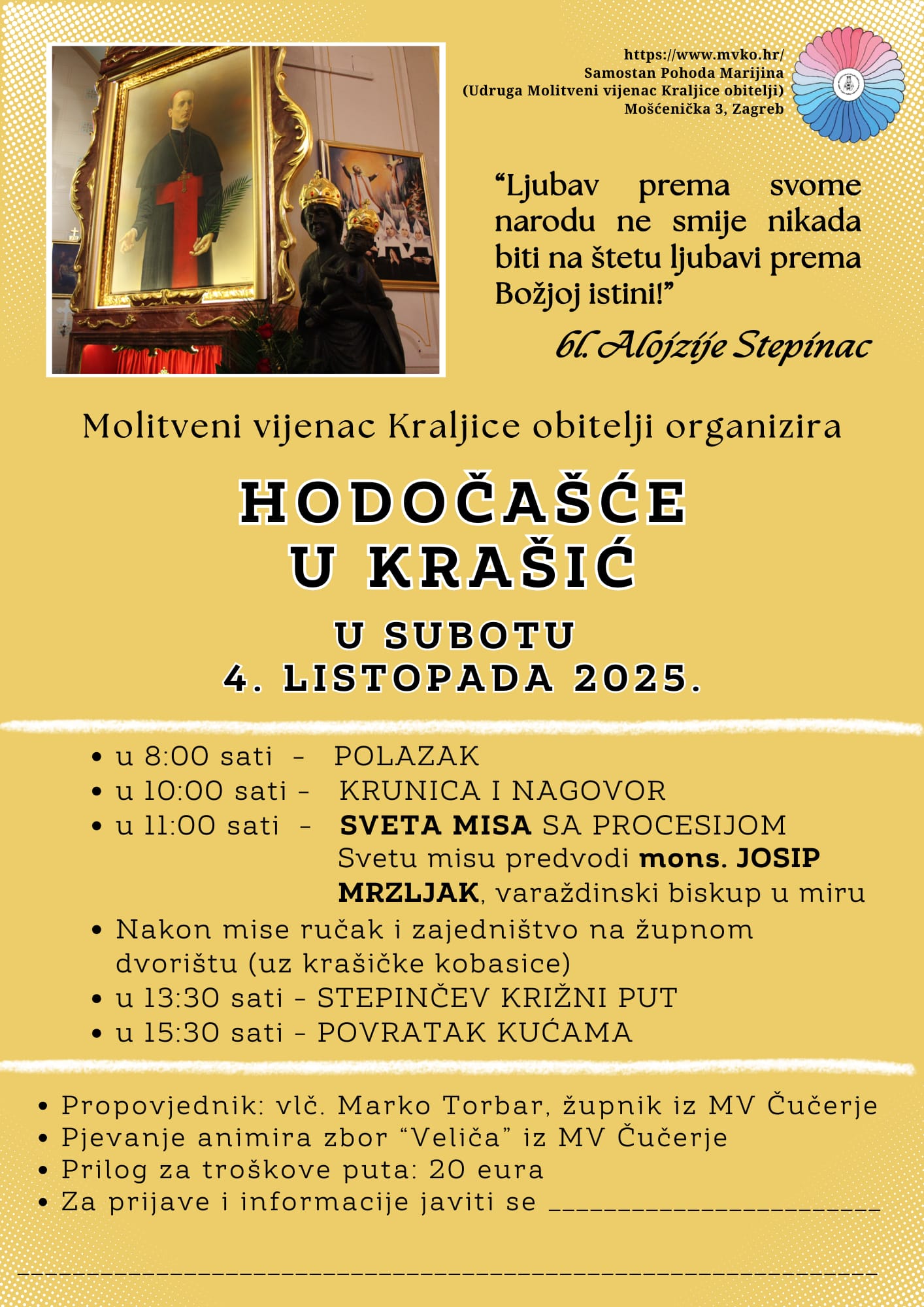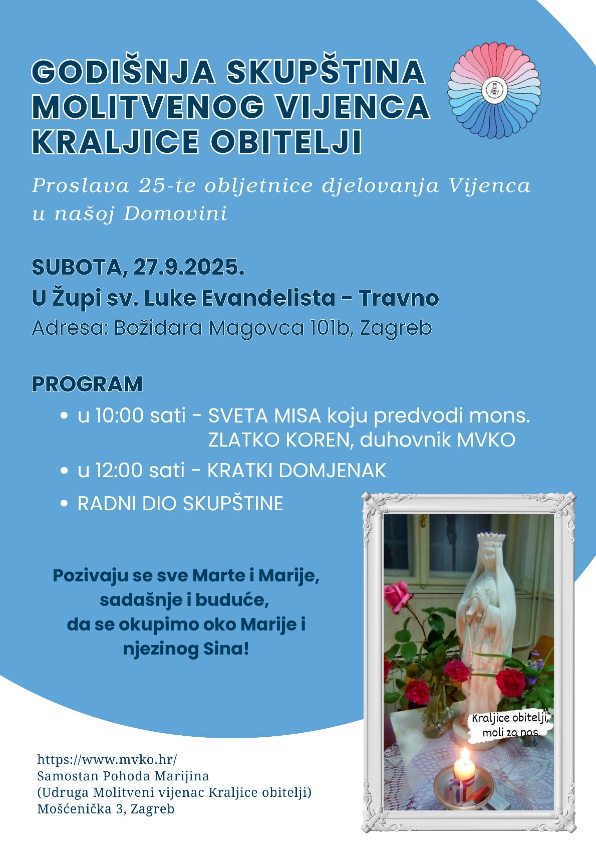 Pozivamo sve koji iskreno žele obnovu katoličke obitelji, koji ljube svoju Crkvu i žele moliti za redovnički i svećenički stalež, kojima je na srcu domovina Hrvatska i njena budućnost, neka nam se pridruže u molitvi i žrtvi s Marijom za dobro Crkve, naroda i Domovine.